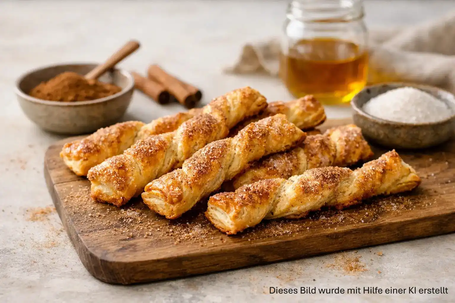 An stressigen Tagen zählt jede Minute. Dann lohnt sich die einfachste Variante überhaupt: Blätterteig ausrollen, mit Butter bestreichen, Zimt und Zucker darübergeben, in Streifen schneiden, verdrehen und backen. Mehr braucht es nicht für ein Ergebnis, das knusprig, duftend und absolut partytauglich ist.