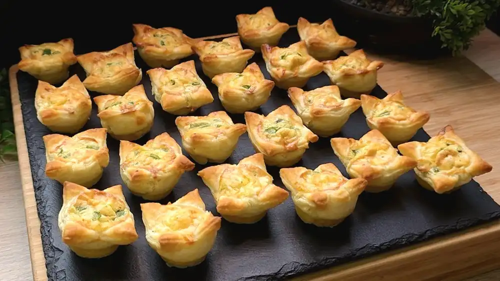 - Backen: Im vorgeheizten Ofen bei 200°C Ober-/Unterhitze ca. 20 Minuten backen, bis die Häppchen goldbraun sind und die Füllung gestockt ist.