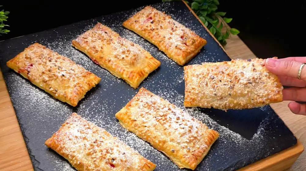 Der Clou ist die einfache Zubereitung: Wir füllen den Teig in Streifen, klappen ihn um und schneiden ihn erst kurz vor dem Backen in Riegel. So bleibt die Füllung genau dort, wo sie sein soll. Gekrönt mit gehackten Haselnüssen und Puderzucker sehen diese Teilchen aus wie vom Profi-Konditor!