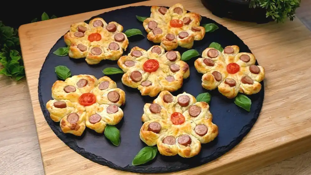 Das Besondere an diesem Rezept ist die kreative Formgebung. Durch das Einschneiden und Umklappen des Teigs entstehen „Blütenblätter“, die mit Würstchenscheiben belegt werden, während eine Tomatenscheibe in der Mitte die perfekte Optik abrundet. Schnell vorbereitet, günstig in den Zutaten und in nur 20 Minuten im Ofen fertig gebacken – so macht Snacken Spaß!