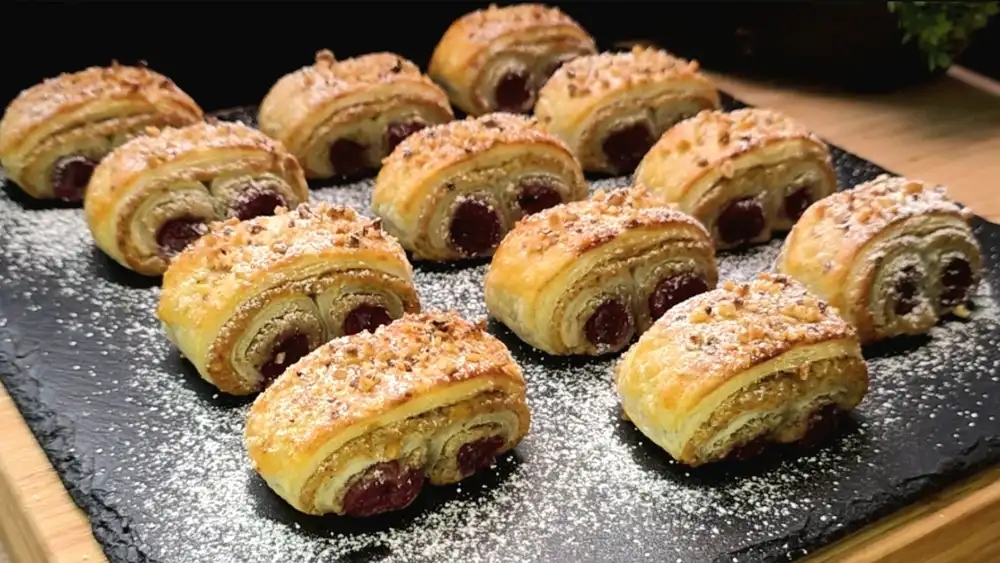 Bist du bereit für ein Gebäck, das in Rekordzeit fertig ist und trotzdem aussieht wie vom Edel-Bäcker? Diese Walnuss-Sauerkirsch-Taschen nutzen einen einfachen Trick: Durch das beidseitige Aufrollen entstehen wunderschöne, gleichmäßige Stücke, die die saftige Füllung perfekt einschließen.