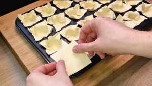 Form füllen: Eine Muffin-Form gut einfetten (oder eine Mini-Muffin-Form verwenden). In jede Vertiefung ein Teigquadrat legen und leicht andrücken.